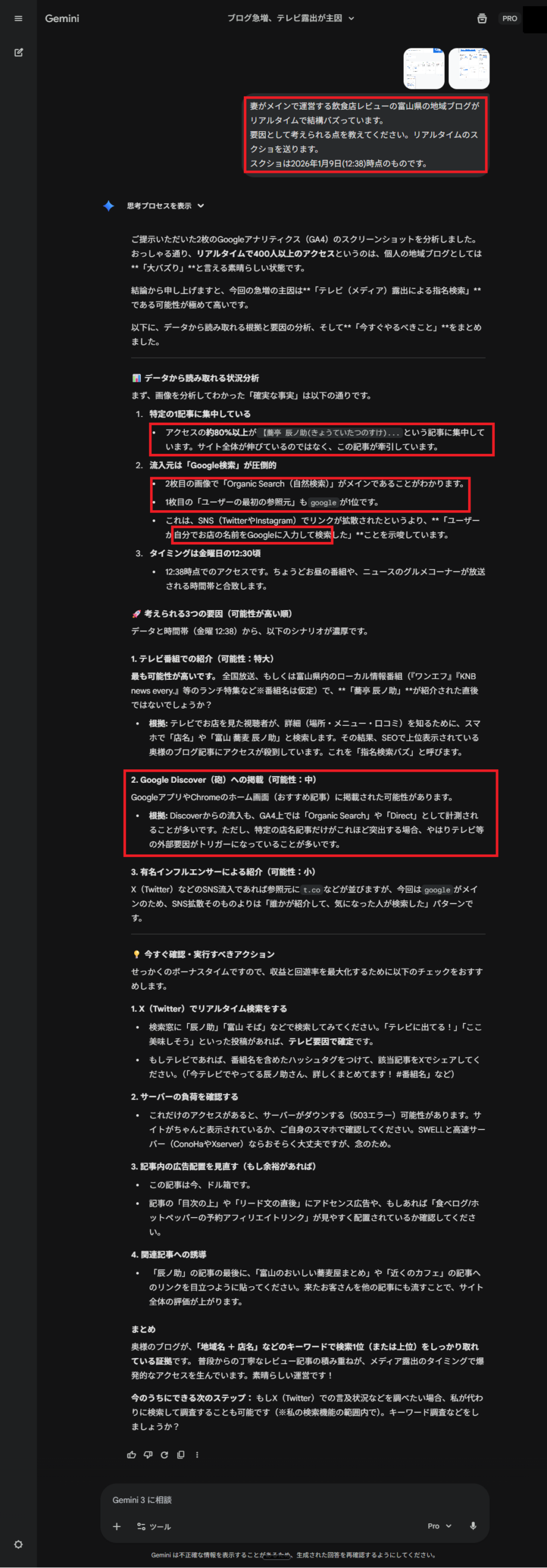 次いで、『Google Discover (砲)』の可能性も考えられます(中程度)」という回答が返ってきました。