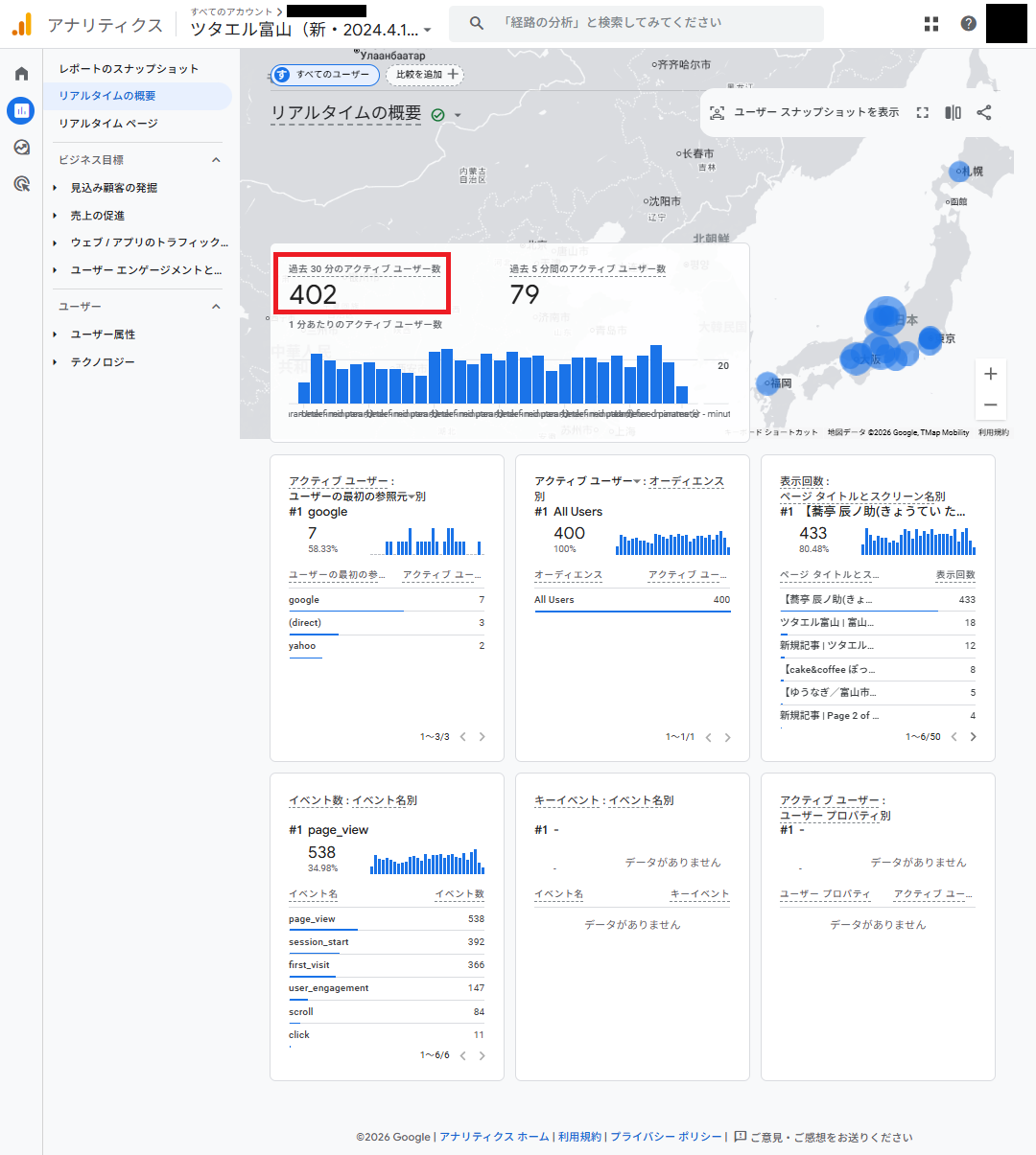 - アナリティクスのダッシュボード(リアルタイム画面)をスクショ。