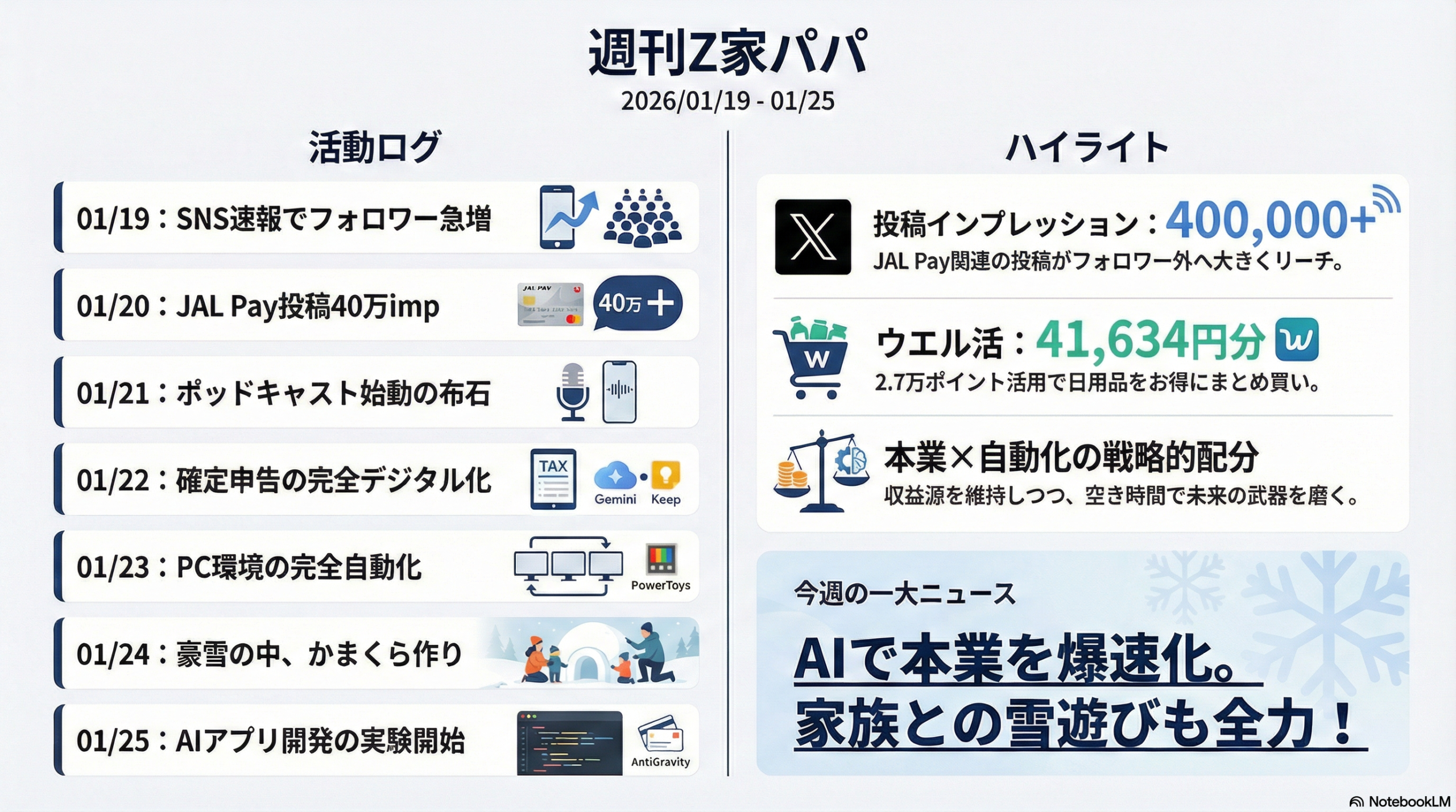 彼の記録には、興味深い二面性が存在します。最先端のAI自動化を深く追求する、鋭い分析者としての一面と、豪雪の中で子供たちとかまくらを作る温かい父親の顔。この二つが、ごく自然に同居しているのです。多忙な日々の中で、仕事の成果と家族との時間、そして未来への投資を、どのようにすればこれほど高い解像度で両立できるのでしょうか?